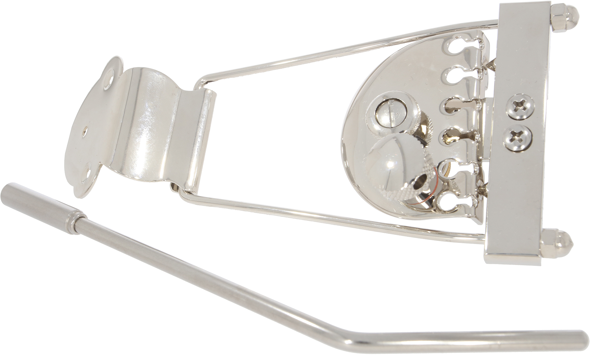 DG-Tremolo-System for mounting on hollowbody guitars with all the advantages of the goeldo DG-series: butter smooth action in 'up & down' mode and an in all dimensions adjustable and stylish shaped round tremolo arm with secure adjustable zero point. This goeldo DG tremolo is mounted in a classic trapezoidal tailpiece, which is screwed to the guitar's side. The necessary screws are included. Total length: 140mm (front edge to side bend)