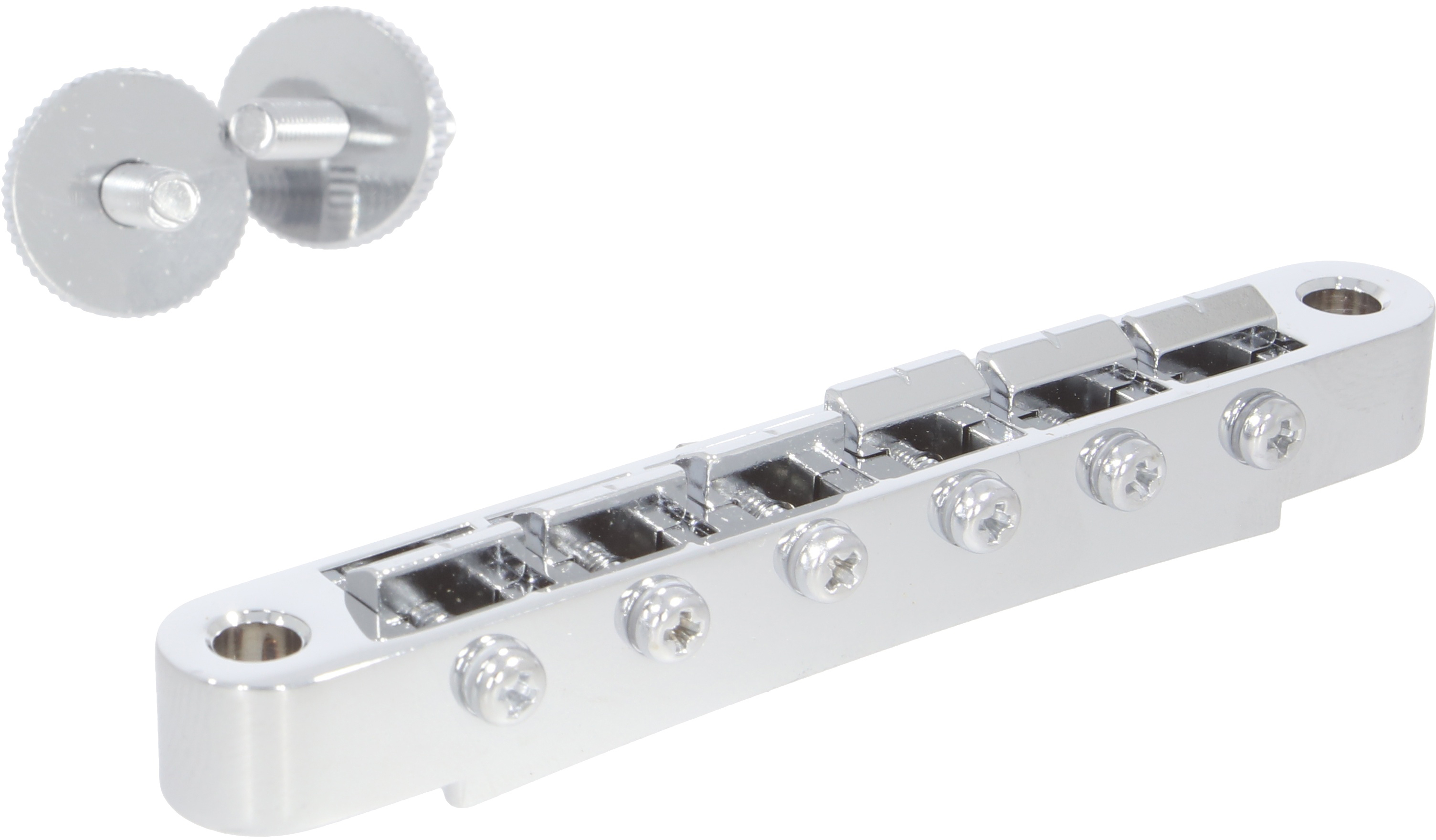 Gotoh GE-104B ABR-style Tunamatic bridge. Narrow construction. Saddles made of zinc. M4 screws. 10,4mm string spacing and 74mm hole diameter. Chrome.