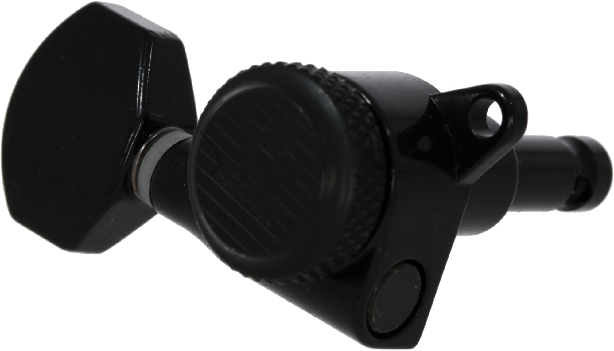 6 left, 45 degrees, Black. German Small button. Drill hole 10mm. Highest possible tuning stability! After the string is put through the horizontal hole of the shaft and is placed tightly over the frets you tighten the wheel on the backside counterclockwise. When doing this a small pin inside the shaft is tightening the string in the hole. After having done this you can start tuning. And our backlock tuners have a genious point: when turning back the locking wheel you finally end up in an open loop so that the wheel cannot fall off and never can get lost!