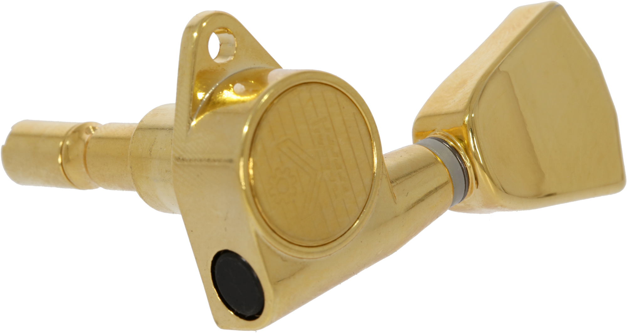 A simple locking machine of highest quality! The slotted locking screw is tighened by a coin and presses on a little steel ball, which tightens the string softly. Compared with other lock tuners this machine head keeps its general function and also works without the locking mechanism very best! 3+3, 90 degrees, tulip buttons. Drill hole 10mm.