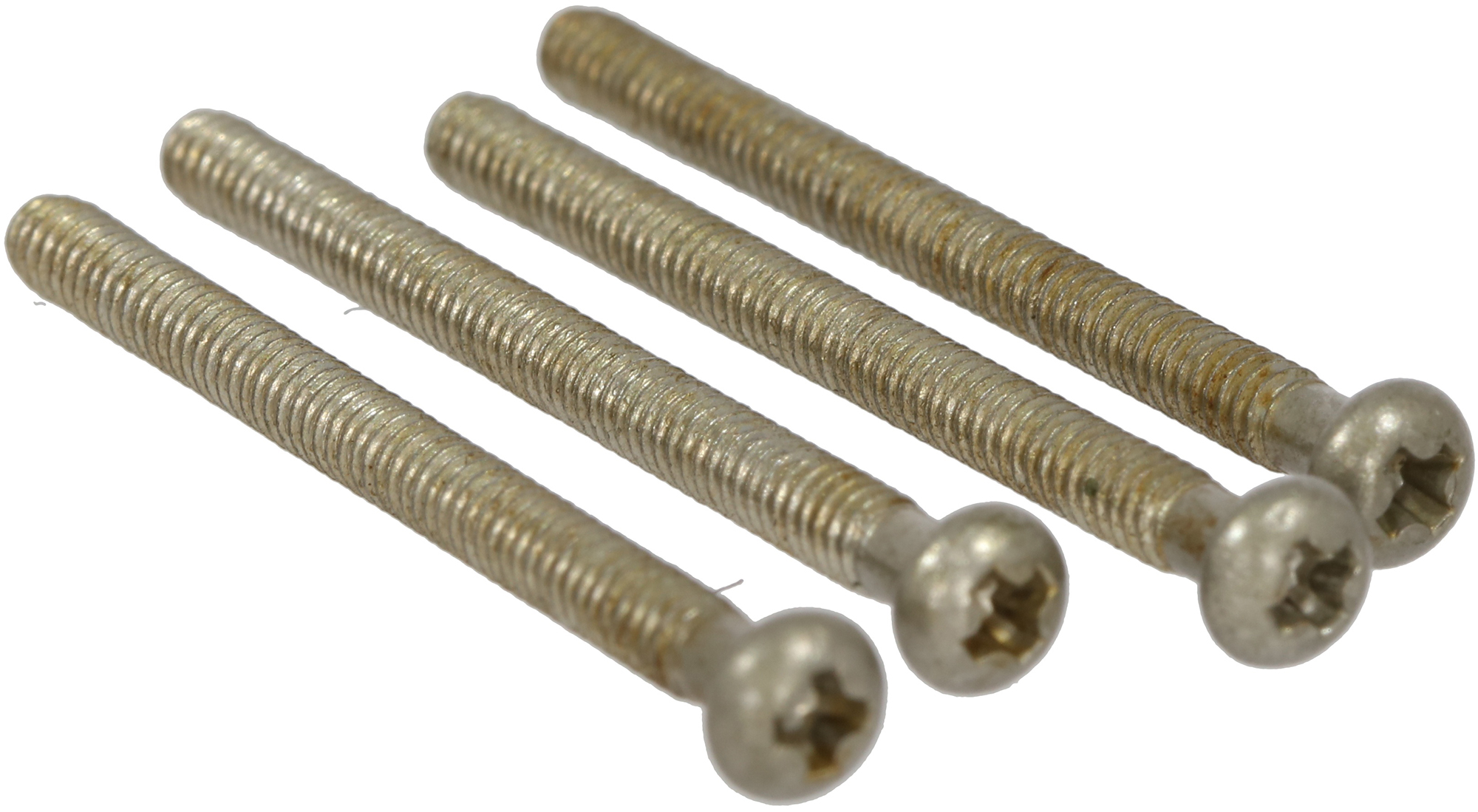 Aged vintage Les-Paul-style pickup screws. 3-48 inch threaded. Length: 1-1/4 inch. Flat head. Set contains 4 pieces.