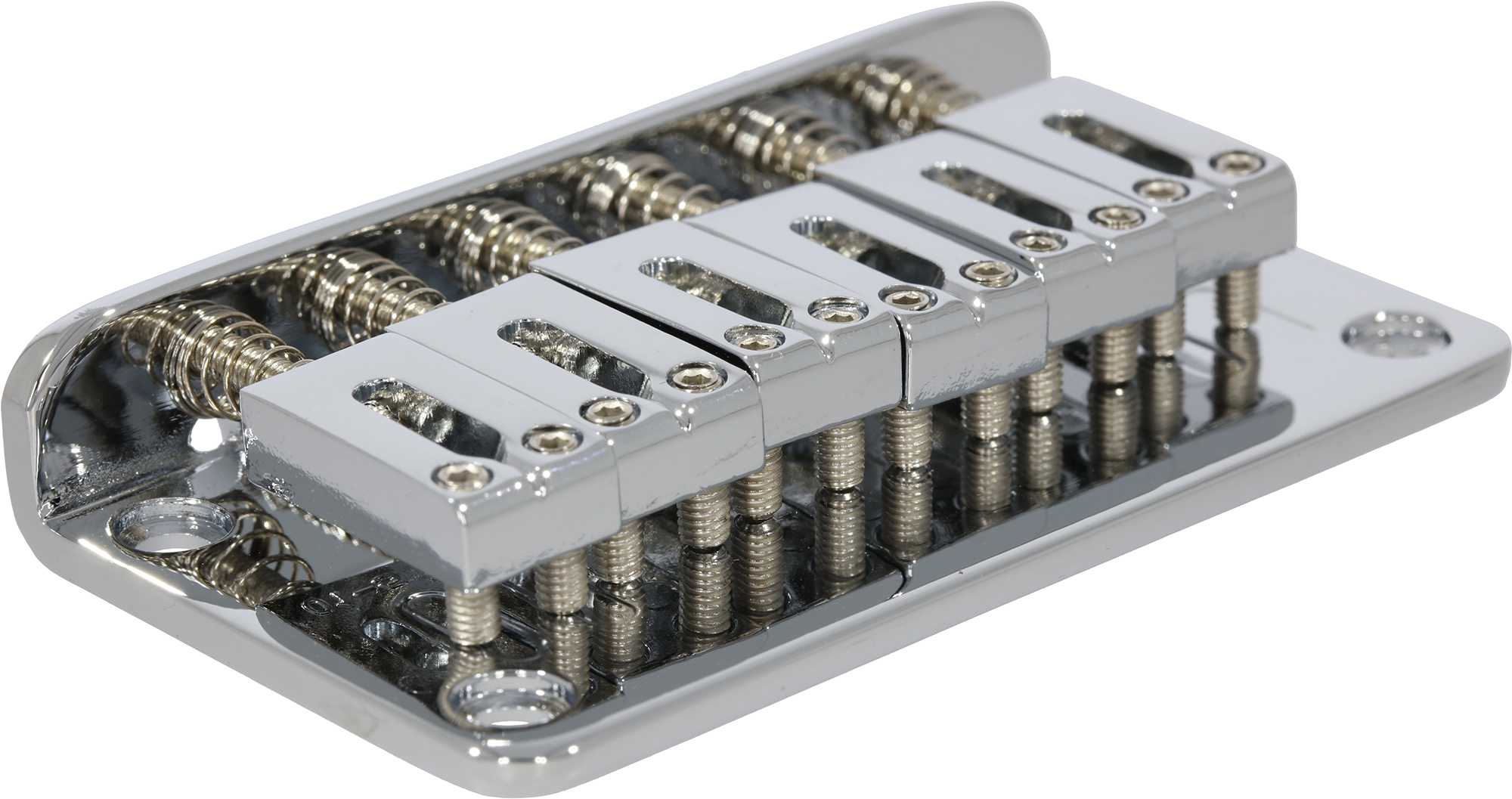 Hardtail bridge tailpiece for Strat style guitars. String spacing: 10,5mm. Strings mounted in bridge. Chrome.