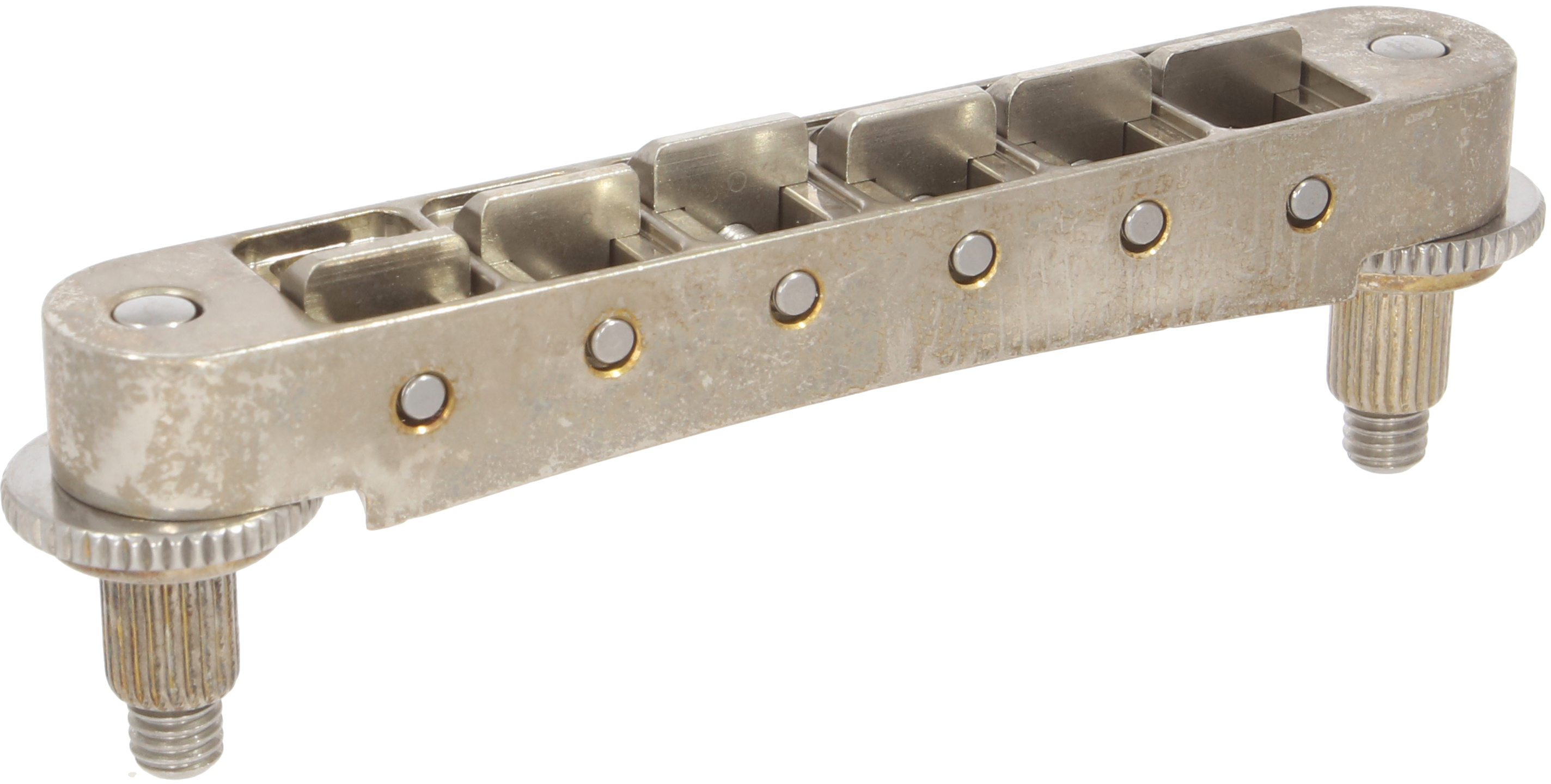 Nashville T.O.M. with extended Intonation range. String spacing 52mm, bolt spacing 74mm, 12 inch radius, milled from solid Bell Brass. Nickel Aged.