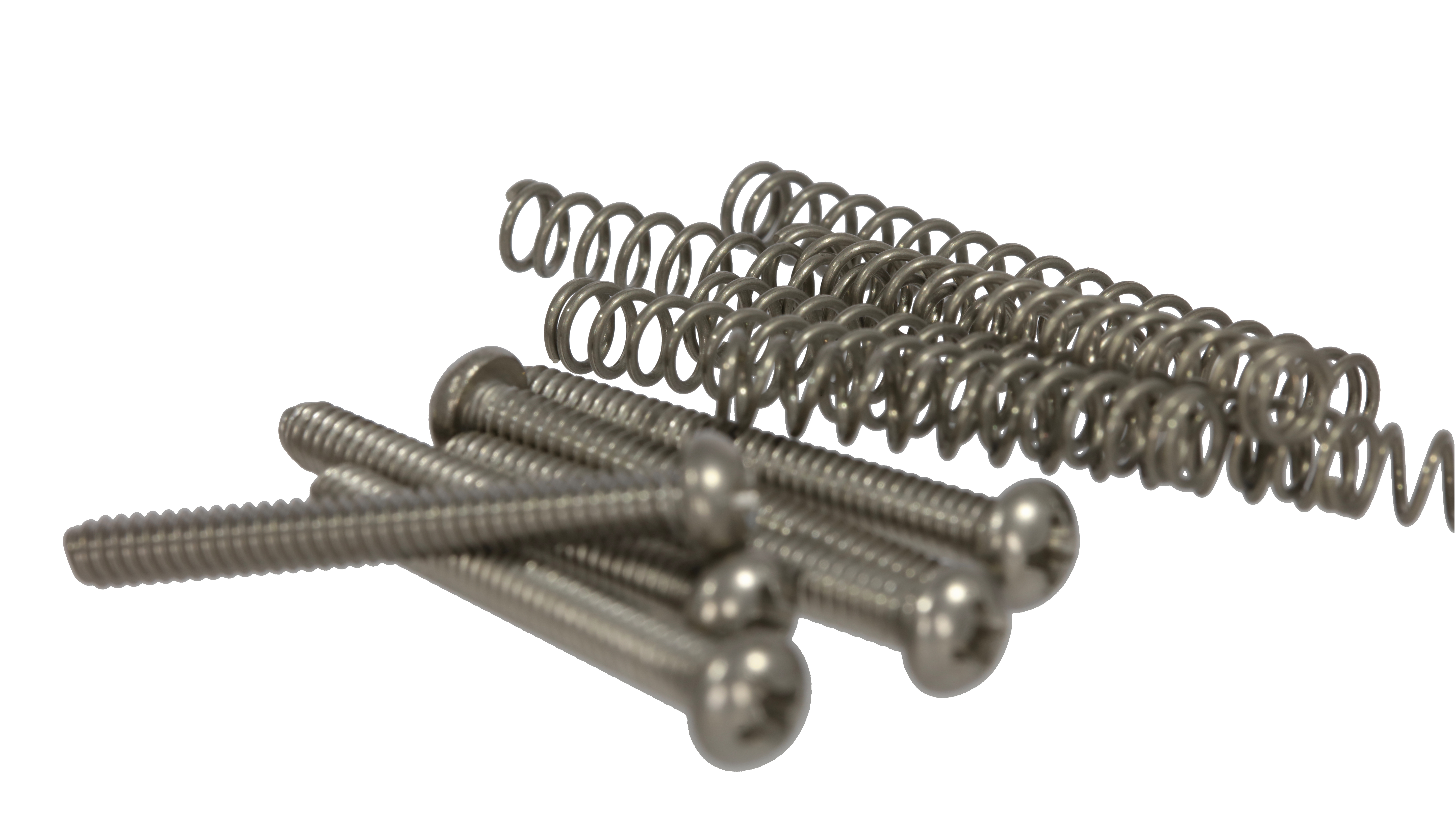 Guitar bridge length screws (6 pieces), with springs. Used for Telecaster style guitar. Made of stainless steel. Size: #6 - 32 x 1-1/4 inch.