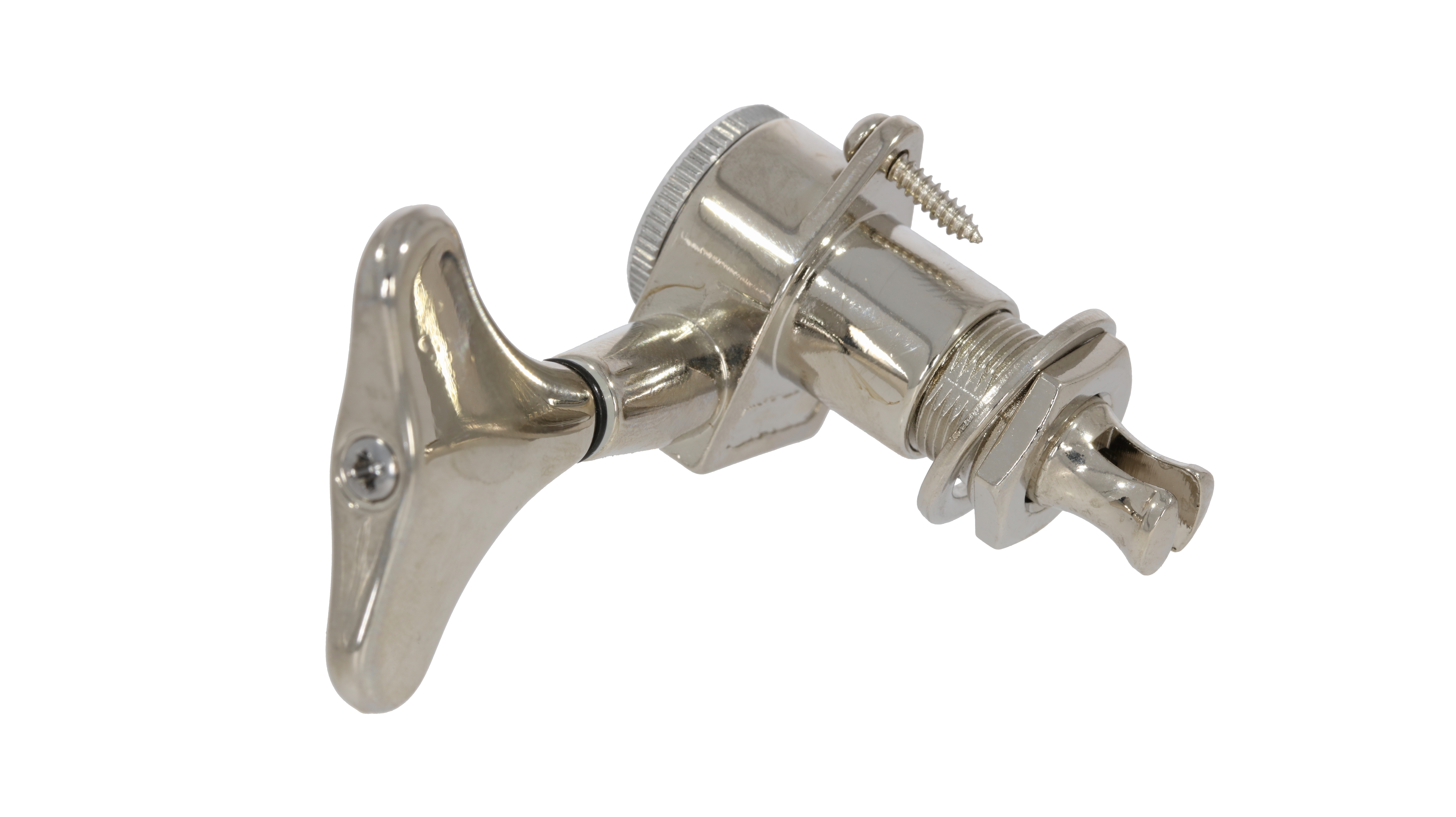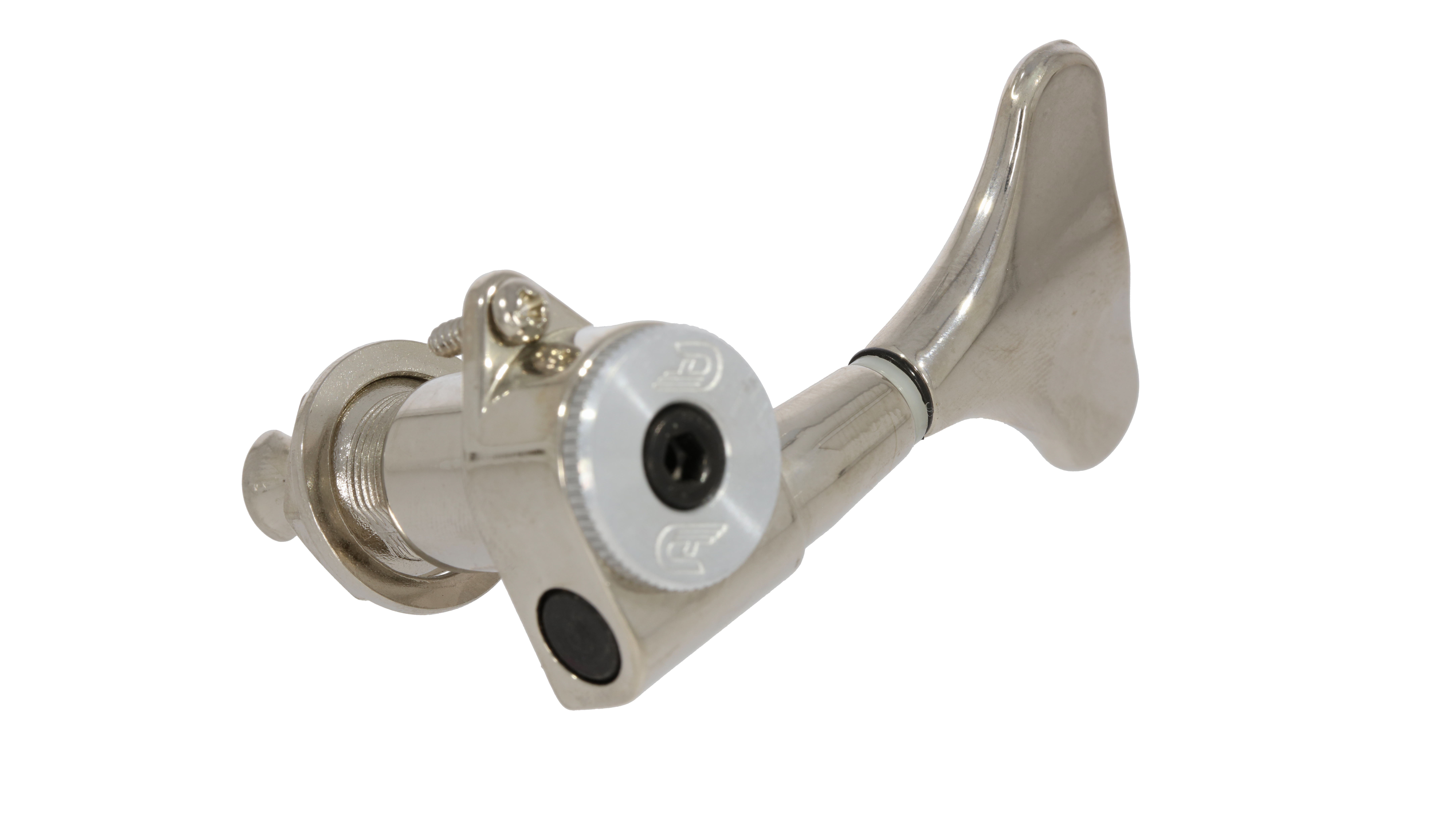 Comfortable stringing and service-friendly! The new Duesenberg idea from Dieter Goelsdorf! The strings are just put all through the tuner. Cut off the end of the string on the backside of the headstock. Then press back 1mm by the tip of your thumb to avoid dangerous sharp ends. Then turn the button and the string is in tune. By turning loose the hex screw the tuner is totally separatable and can be relubricated. Perfect! These tuners come by piece. Make your choice! Drill hole 10mm. 1 left, Nickel