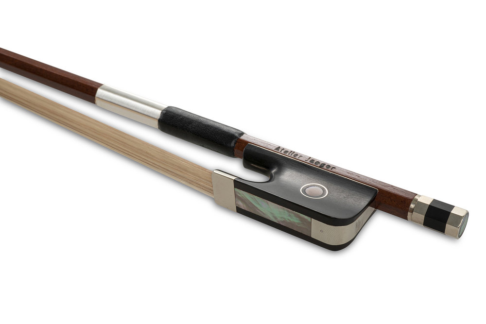 Cello bow Massaranduba Student 3/4, arches. Ebony frog. Natural hair cover. Student bow. Ebony frog with Parisian eye. Natural hair cover. Selected quality. Angular stick. Stamped Atelier Jaeger. . .