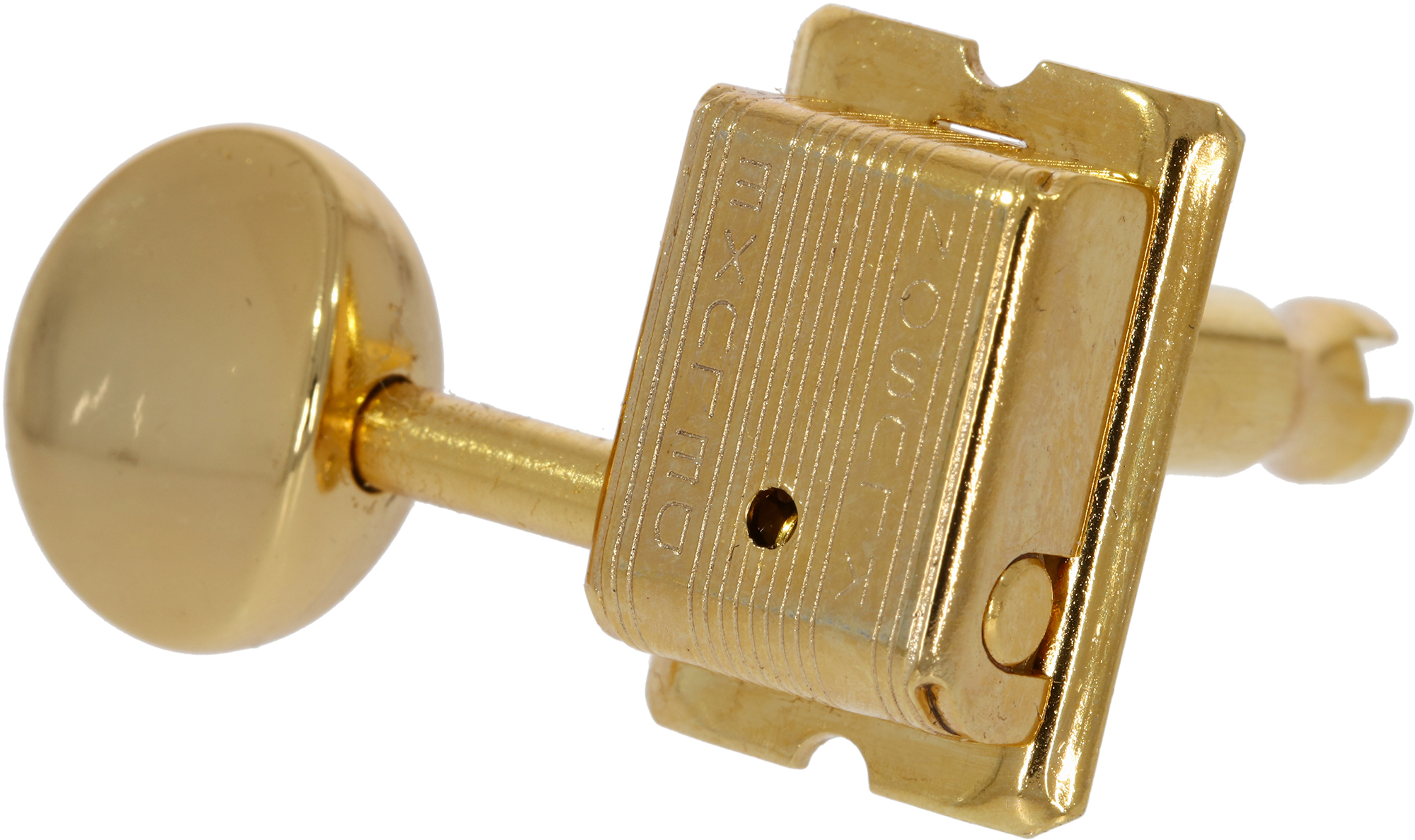 Reproduction of Kluson tuners beginning of the 60s with 'Double Line' stamp. Drill hole 8.5mm. Oval buttons, 6-left, gear ratio 1:15. 6 left, gold.