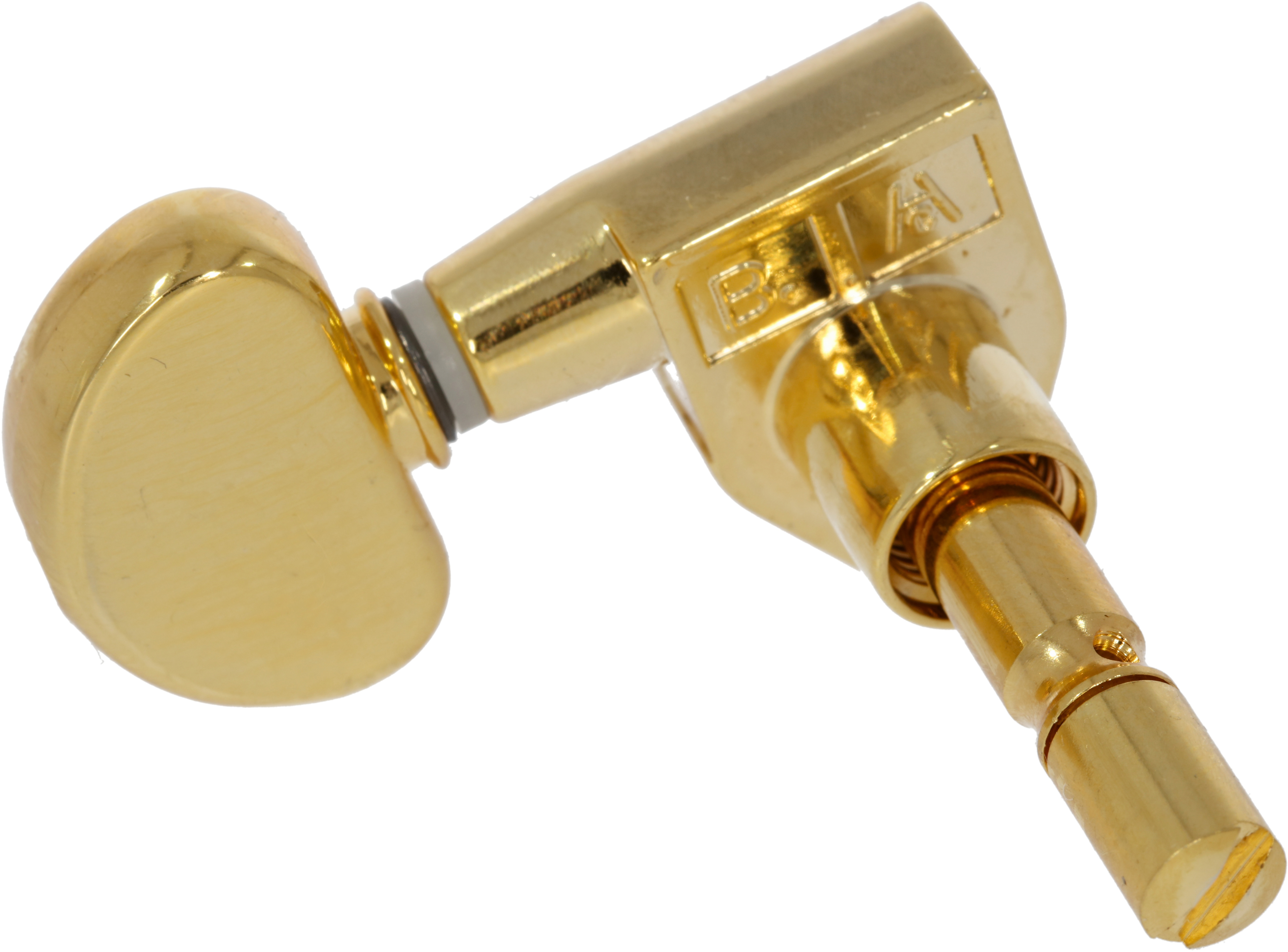 3+3, 90 degrees, Gold. Kidney button. A simple locking machine of highest quality! The slotted locking screw is tighened by a coin and presses on a little steel ball, which tightens the string softly. Compared with other lock tuners this machine head keeps its general function and also works without the locking mechanism very best! Drill hole 10mm. Gear ratio 1:18.