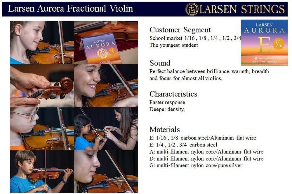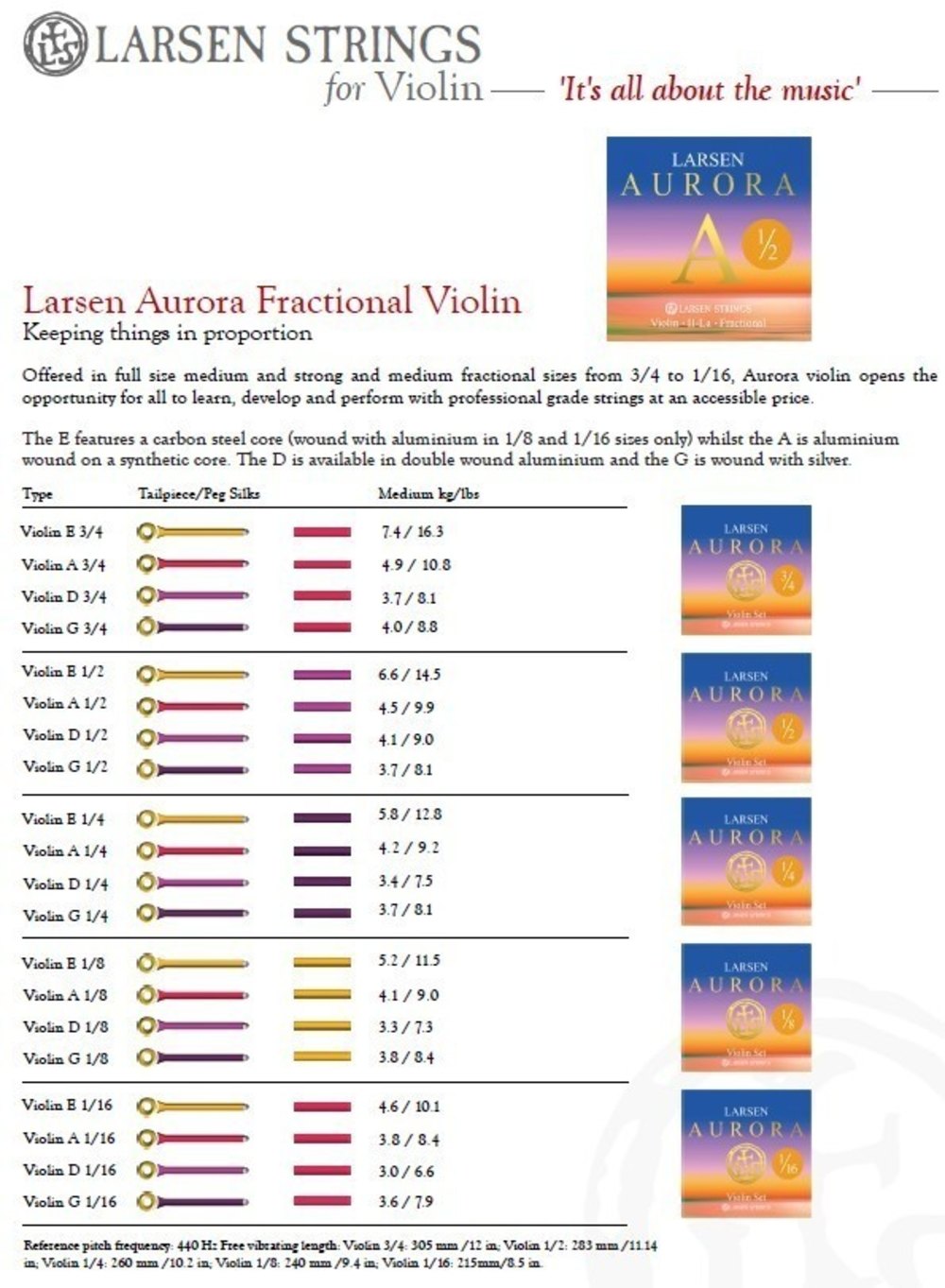 Aurora Violin Strings E 3/4 ball removable, Strings for string instruments. Larsen Aurora strings. A, D, and G strings with plastic core. Warm, brilliant sound without metallic overtones.. The entire range offers impressive string response and playing characteristics.. Bulk strings (10 per note, laid out in a plastic tube). Price per single string. Medium tension. For workshop use: ideal for new construction and rental instruments. Delivered exclusively to violin makers. Larsen Aurora 3/4 violin, scale length 305mm / 12 inch. . . bulk