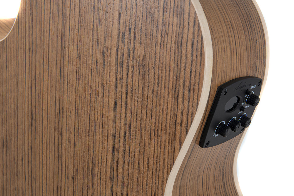 Electric acoustic guitar Jump OM Cutaway Electro Celeste, ovation. Top: solid European spruce. dovetail neck joint. back and sides: Ovangkol. neck: European maple. fingerboard and bridge: Ovangkol. pinless bridge design. dot fingerboard inlays. maple binding. scale: 648mm. nut width 45mm. 20 nickel silver frets. Adamas strings 1818NU .012- .053, GEWA 664.650. bonoid nut and bridge insert with compensation. open-pore matte finish, matte colored top. with jump design pickguard. matte chrome tuners. cutaway. Applause AP3PT preamp with tuner. . AEO-69-T