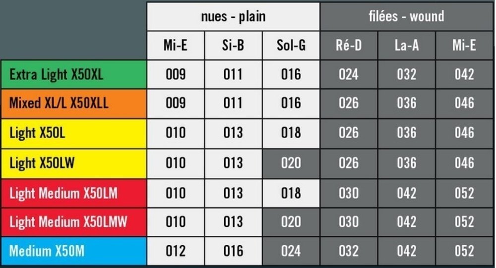 Electric guitar strings Nickel Explosion Roundcore Light-Med. wound G .010-.052, Electric guitar strings. Nickel-plated steel on a traditional round core. Significantly less tension, better flexibility, and more sustain than hexcore strings with a hexagonal core. Optimal sound, easy to play, long sustain. Round core strings must not be shortened BEFORE stringing, otherwise the winding could come loose and the string would become unusable. X50LMW Nickel Explosion .010-.045 G wound light-medium. light-medium wound G .010 .013 .020w .030w .042w .052w. No individual strings available!. . . X50LMW